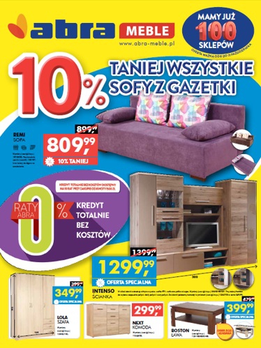 Nowa gazetka promocyjna sieci sklepów Abra Meble – „10% taniej wszystkie sofy z gazetki”.