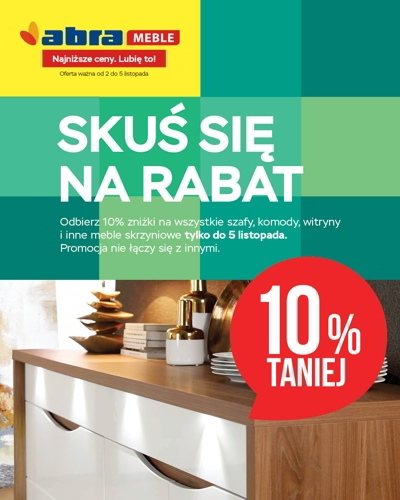 Odbierz 10% zniżki na wszystkie szafy, komody, witryny i inne meble skrzyniowe. Promocja nie łączy się z innymi.