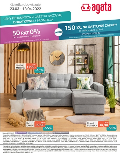 ’50 rat 0% bez dodatkowych kosztów albo 150 zł na następne zakupy za każde wydane 1000 zł’ – nowa gazetka promocyjna sieci salonów Agata.