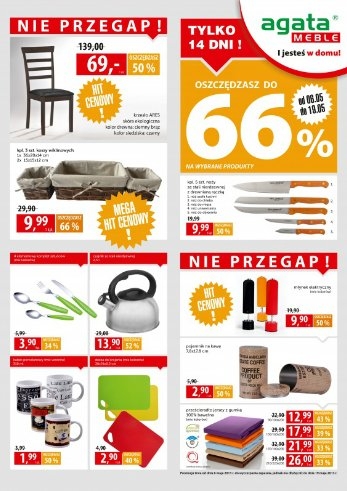 Oferta ważna od 6.05 do 19.05 w salonach Agata Meble w Bielsku-Białej, Gliwicach, Gdańsku (Morski Park Handlowy), Kaliszu, Katowicach, Łodzi, Opolu, Płocku, Poznaniu (od 10.05), Rybniku, Szczecinie, Warszawie (CK 61) i Wrocławiu.