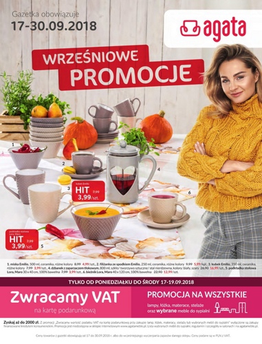 ’Wrześniowe promocje’ – nowa gazetka promocyjna sieci salonów Agata z artykułami wyposażenia wnętrz.