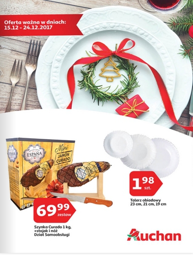 Na okładce aktualnej gazetki promocyjnej sieci marketów Auchan znajdziemy szynkę Curado 1 kg w zestawie ze stojakiem i nożem za 69,99 zł i talerze obiadowe w cenie 1,98 zł za 1 sztukę.