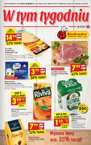 Na okładce gazetki znajdziemy sześć produktów w atrakcyjnych cenach oraz informację o akcji promocyjnej, w której wybrane kawy są do nabycia min. 20% taniej. Kolejne strony gazetki to informacja o premierze Teatrzyku Świeżaków 15. września w telewzji TVN przed godziną 19 oraz o konkursie Zrób świeżakowy obrazek i wygraj. Na następnych stornach gazetki sieci sklepów Biedronka znajdziemy akcje promocyjne, tj. 5 razy więcej smaku od śniadania do kolacji, Świeże Mięso, Ryby są smaczne w Biedronce, Pyszne śniadanie, Kup 2 i zapłać mniej oraz Czas na kawę, w której ceny zostały obniżone o min. 20%, np. kawa rozpuszczalna Nescafe Classic + kubek XL za 16,99 zł, kawa ziarnista Lavazza Crema e Gusto 1 kg za 39,99 zł, kawa mielona lub ziarnista Lavazza Qualita Oro 250 g za 13,89 zł, kawa mielona Parana 500 g za 7,49 zł, kawa ziarnista Le Grand 500 g za 12,49 zł czy kawa mielona Tchibo Family 450 g za 7,99 zł.