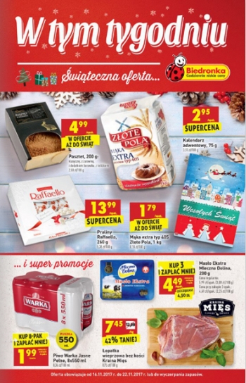 Pierwsza strona aktualnej gazetki promocyjnej W tym tygodniu Świąteczna oferta sieci sklepów Biedronka prezentuje następujące artykuły: pasztet w ofercie aż do świąt 200 g w cenie 4,99 zł, mąkę extra Złote Pola typ 450 1 kg za 1,79 zł, kalendarz adwentowy 75 g za 2,95 zł, praliny Raffaello 260 g za 13,99 zł, a także piwo Warka Jasne Pełne w puszce 550 ml w cenie 1,99 zł przy zakupie 8 sztuk, łopatkę wieprzową bez kości Kraina Mięs 1 kg za 7,45 zł i masło Ekstra Mleczna Dolina 200 g w cenie 4,49 zł przy zakupie 3 sztuk.