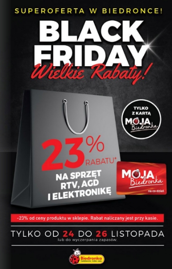 Superoferta w Biedronce, czyli Black Friday Wielkie Rabaty tylko od 24 do 26 listopada. W ofercie sprzęt RTV, AGD i elektronika dla posiadaczy karty Moja Biedronka z rabatem 23%.