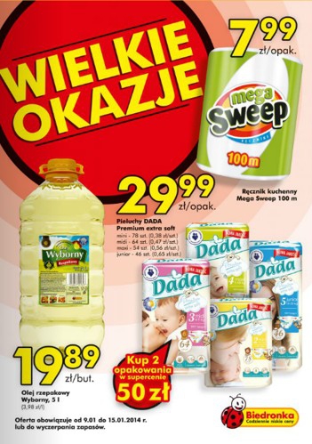 - Pieluchy Dada Premium extra soft 2 opakowania – 50 zł.