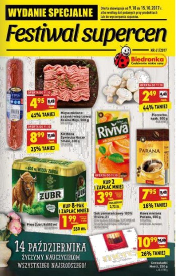 Okładka aktualnej gazetki promocyjnej Festiwal super cen sieci sklepów Biedronka prezentuje mięso mielone z szynki wieprzowej Kraina Mięs 500 g za 4,95 zł, kiełbasę żywiecką Nasze Smaki 600 g za 8,99 zł, pieczarki 500 g za 2,49 zł, piwo Żubr w puszce 550 ml w cenie 1,99 zł za 1 puszkę przy zakupie 8, sok pomarańczowy Riviva 2 litry za 3,99 zł przy zakupie 2 opakowań i kawę mieloną Parana 500 g za 7,95 zł oraz z okazji Dnia Nauczyciela czekoladki Merci 250 g za 10,99 zł.