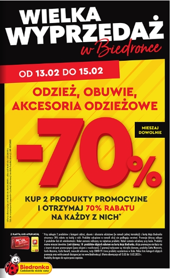 * – przy zakupie 2 produktów z kategorii odzież, obuwie i akcesoria odzieżowe (w ramach jednej transakcji) z kartą Moja Biedronka otrzymasz 70% rabatu na każdy z nich. Produkty zakupione w ramach akcji nie podlegają zwrotowi. Promocja dotyczy 2 produktów lub ich wielokrotności. Rabat zostanie naliczony na najtańsze produkty. Produkty można mieszać dowolnie. Limit dzienny wynosi 10 produktów. Akcja promocyjna nie łączy się z innymi akcjami promocyjnymi (poza akcjami z voucherami). Z promocji wyłączone są tekstylia domowe, produkty Gatta Moments, Carlo Massimo, Carla Bonetti, maseczki ochronne, testy Covid-19 i inne produkty wymienione w liście znajdującej się na stronie biedronka.pl. Oferta obowiązuje od poniedziałku 13.02 do srody 15.02. Produkty dostępne do wczyerpania zapasów.