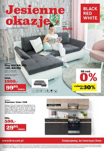Artykuły z gazetki promocyjnej Jesienne okazje Black Red White dostępne są również w 20 ratach 0%, np. narożnik Play RECBK.3DL za 1999 zł lub w 20 ratach po 99,95 zł miesięcznie czy kuchnia Junona Line 240 za 599 zł lub w 20 ratach po 29,95 zł miesięcznie.