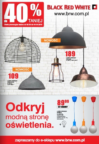 Nowa gazetka promocyjna Black Red White – „Odkryj modną stronę oświetlenia do 40% taniej”.