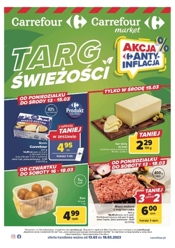 ’Targ świeżości. Akcja anty-inflacja. Co tydzień nowe atrakcje cenowe’ – nowa gazetka promocyjna sieci marketów Carrefour.