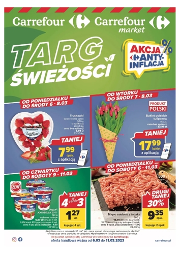 ’Targ świeżości. Akcja anty-inflacja. Co tydzień nowe atrakcje cenowe’ – nowa gazetka promocyjna sieci marketów Carrefour.