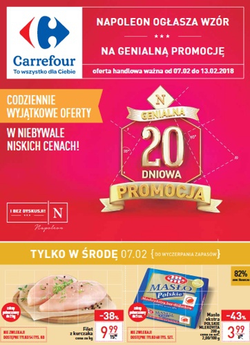 Nowa gazetka promocyjna sieci sklepów Carrefour – „Napoleon ogłasza wzór na genialną promocję”.