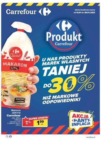’U nas produkty marek własnych taniej do 30% niż markowe odpowiedniki’ – nowa gazetka promocyjna sieci marketów Carrefour.