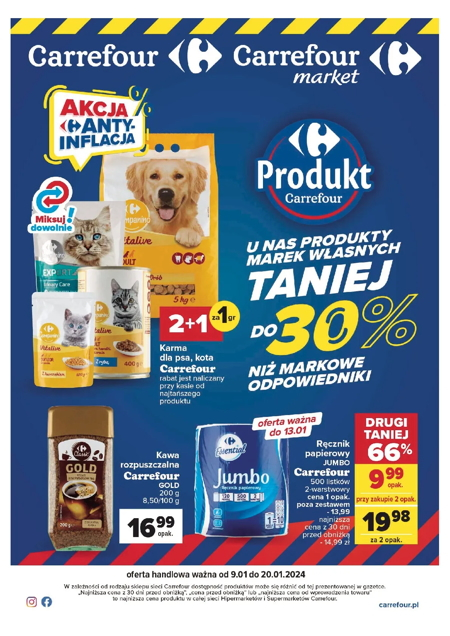 ’U nas produkty marek własnych do 30% taniej niż markowe odpowiedniki’ – nowa gazetka promocyjna sieci marketów Carrefour.