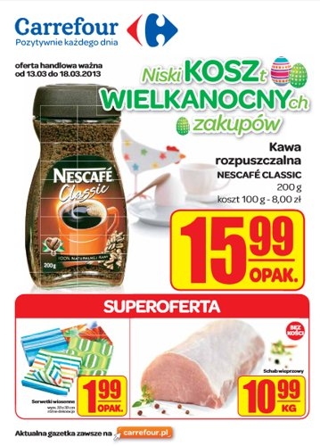 Najnowsza gazetka promocyjna Carrefour – „Niski KOSZt WIELKANOCNYch zakupów”.