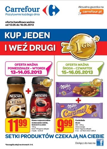 Nowa gazetka promocyjna Carrefour – „Kup jeden i weź drugi za 1 gr”.