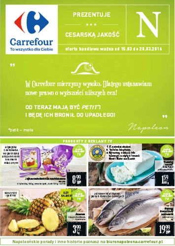 Nowa gazetka promocyjna sieci handlowej Carrefour – „Carrefour prezentuje cesarską jakość”.