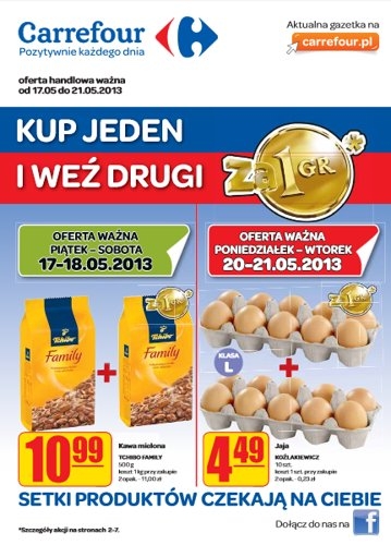 Nowa gazetka promocyjna Carrefour – „Kup jeden i weź drugi za 1 gr”.