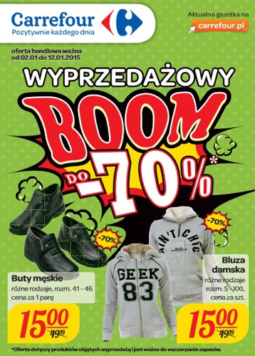 Nowa gazetka promocyjna sieci handlowej Carrefour – „Wyprzedażowy Boom do -70%”.