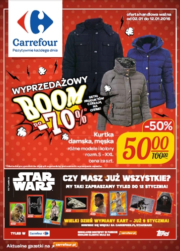 Nowa gazetka promocyjna sieci handlowej Carrefour – „Wyprzedażowy BOOM do -70%”.