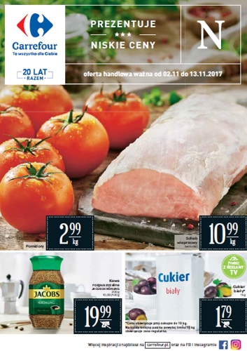Gazetka promocyjna sieci marketów Carrefour rozpoczyna się od czterech promocji, tj. pomidory 1 kg za 2,99 zł, schab wieprzowy bez kości 1 kg za 10,99 zł, kawa rozpuszczalna Jacobs Kronung 200 g za 19,99 zł i produkt z reklamy TV – cukier biały w cenie 1,79 zł za 1 kg.