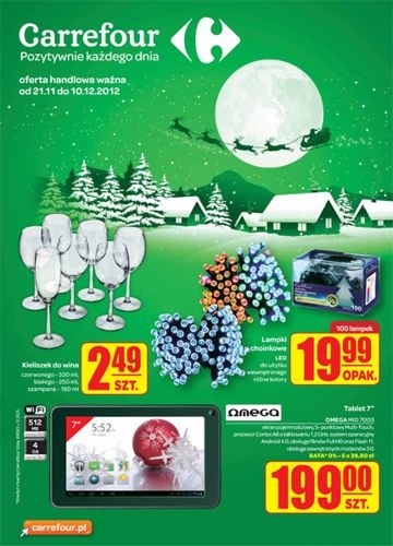 Zapraszamy do przeglądania najnowszej gazetki elektronicznej Carrefour Prezenty. Lampki choinkowe 19,99 za opakowanie , kieliszki do wina białego , czerwonego oraz do szampana 2,49 za szt . Oferta ważna od 21.11 do 10.12.