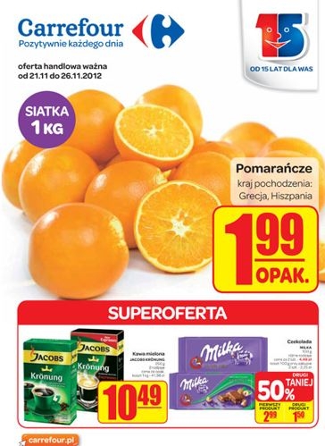 Zapraszamy do przeglądania najnowszej gazetki elektronicznej Carrefour. Pomarańcze 1 kg 1,99 . Oferta ważna od 21.11 do 26.11.