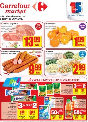Zapraszamy do przeglądania najnowszej gazetki elektronicznej Carrefour market . Pomarańcze 1 kg 1,99 , karkówka wieprzowa 13,99 za kg , kiełbasa podwawelska 9,99 za kg , kiełbasa toruńska 9,99 za kg . Oferta ważna od 21.11 do 26.11.