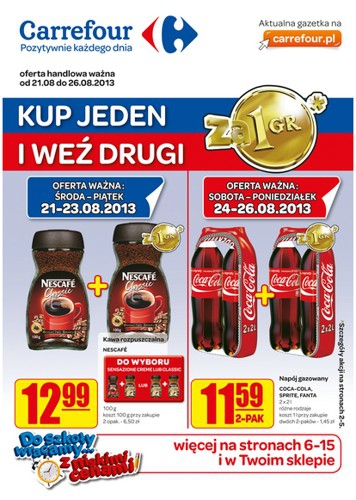 Nowa gazetka promocyjna sieci handlowej Carrefour – „Kup jeden i weż drugi za 1 gr”.