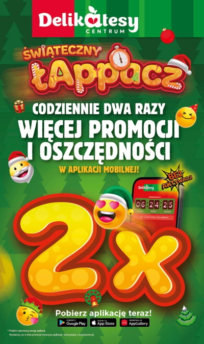 ’Świąteczny Łappacz. Codziennie dwa razy więcej promocji i oszczędności w aplikacji mobilnej!’ – nowa gazetka promocyjna Delikatesów Centrum.