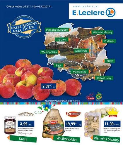 Na okładce najnowszej gazetki promocyjnej E.Leclerc znajdziemy jabłka lubelskie klasa ekstra 1 kg w cenie 2,59 zł, powidła śliwkowe Nałęczowskie Sady 360 g w cenie 3,99 zł, perliczkę świeżą Drosed 1 kg za 19,99 zł i kartacze z mięsem ETC Polskie Specjały w cenie 11,99 zł za 1 kg. Kolejne 15 stron gazetki E.Leclerc składa się z wielu promocji podzielonych na konkretne regiony.