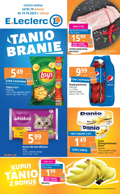 Oferta obowiązuje w dniach obowiązywania gazetki promocyjnej E.Leclerc z wyjątkiem cen produktów oznaczonych inną datą lub do wyczerpania zapasów. Wszytskie ceny są wyrażone w polskich złotych i zawierają podatek VAT. Ceny dotyczą produktów bez dekoracji. Oferta dotyczy wylącznie sprzedazy detalicznej. Niektóre produkty nie są dostępne w każdym sklepie, a informacji na ten temat udziela Punkt Obsługi Klienta.
