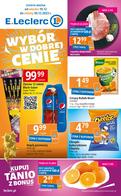 Oferta obowiązuje w dniach obowiązywania gazetki promocyjnej E.Leclerc z wyjątkiem cen produktów oznaczonych inną datą lub do wyczerpania zapasów. Wszystkie ceny są wyrażone w polskich złotych i zawierają podatek VAT. Ceny dotyczą produktów bez dekoracji. Oferta dotyczy wyłącznie sprzedaży detalicznej. Niektóre produkty nie są dostępne w każdym sklepie, a informacji na ten temat udziela Punkt Obsługi Klienta.