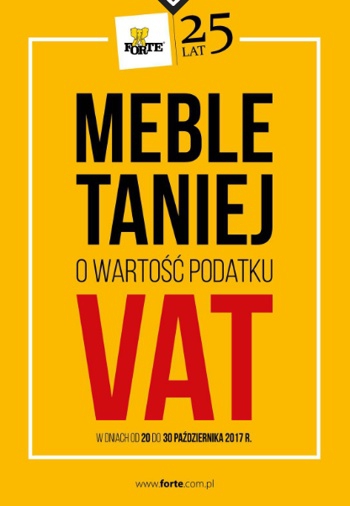 Nowa gazetka promocyjna sieci sklepów meblowych Forte – „Meble taniej o watość podatku VAT”.
