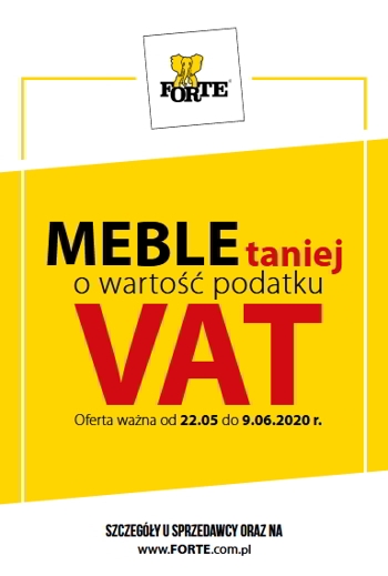 ’Meble i artykuły dekoracyjne taniej o wartość podatku VAT’ – nowa gazetka promocyjna sieci sklepów meblowych Forte.