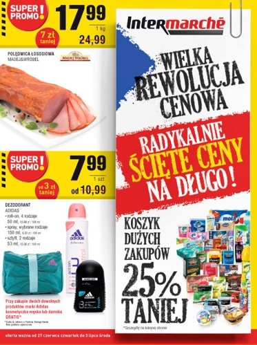 Aktualna gazetka promocyjna sieci handlowej Intermarche – „Wielka rewolucja cenowa! Radykalnie ścięte ceny na długo!”.