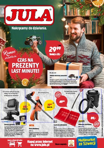 Na okładce aktualnej gazetki promocyjnej Czas na prezenty Last Minute sieci multimarketów ze Szwecji Jula znajdziemy wytrzymały i zwrotny zdalnie sterowny samochód Coolerstuff w cenie 29,99 zł, kamerę sportową MerQuant za 69 zł, ścisk pistoletowy Bahco za 19,99 zł, łopatę do odśnieżania Hard Head za 49,99 zł i odkurzacz kominkowy Meec o mocy 800 W za 89 zł.