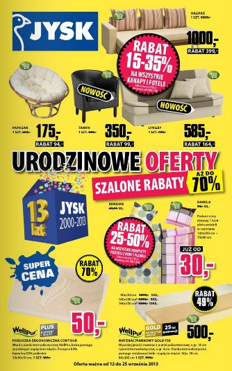 Nowa gazetka promocyjna JYSK – „Urodzinowe oferty. Szalone rabaty aż do 70%”.