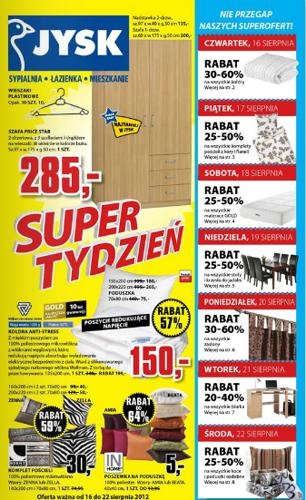 W JYSKU znajdziesz wszystko czego potrzebujesz do łazienki , sypialni , pokoju dziennego , biura oraz ogrodu . Od 16.08 obowiązuje nowa oferta promocyjna.