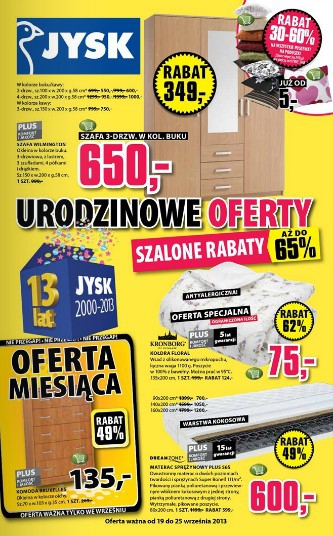 Nowa gazetka promocyjna JYSK – „Urodzinowe oferty. Szalone rabaty aż do 65%”.