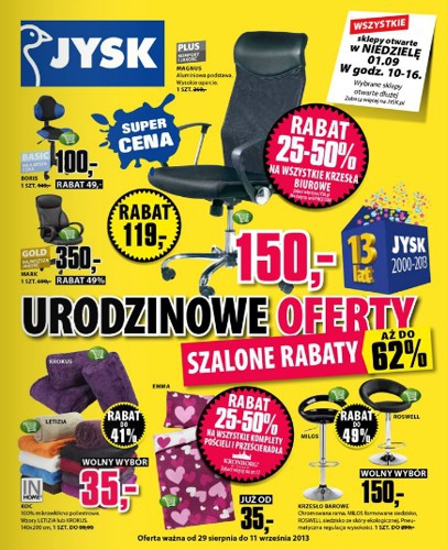 Nowa gazetka promocyjna JYSK – „Urodzinowe oferty. Szalone rabaty do 62%”.