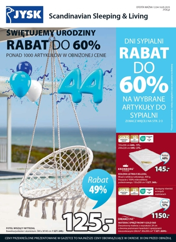 ’Świętujemy urodziny. Rabat do 60%. Ponad 1000 artykułów w obniżonej cenie’ – nowa gazetka promocyjna sieci sklepów JYSK.