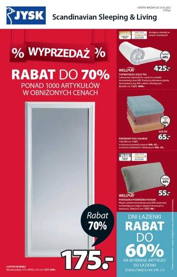 ’Wyprzedaż. Rabat do 70%. Ponad 1000 artykułów w obniżonych cenach’ – nowa gazetka promocyjna sieci sklepów JYSK.