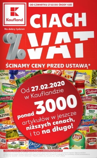 ’Ciach VAT. Ścinamy ceny przed ustawą. Ponad 3000 artykułów w jeszcze niższych cenach, i to na długo!’ – nowa gazetka promocyjna sieci marketów Kaufland.