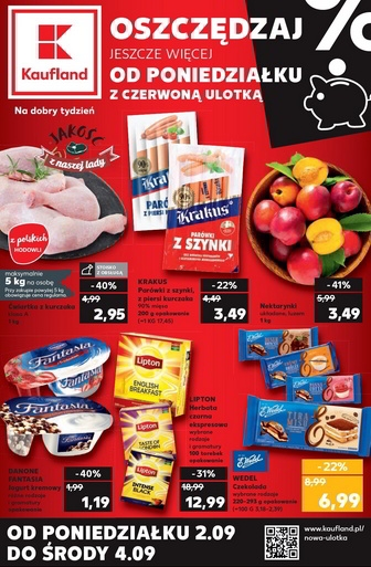 ’Oszczędzaj jeszcze więcej od poniedziałku z czerwoną ulotką’ – nowa gazetka promocyjna sieci marketów Kaufland.