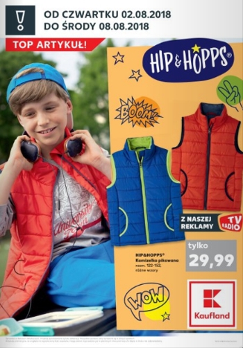 Gazetka liczy tylko dwie strony i w całości została poświęcona marce Hip&Hopps. Znajdziemy w niej ubrania dla dzieci w rozmiarach 122-152, tj. kamizelka pikowana Hip&Hopps w różnych wzorach za 29,99 zł, bluza chłopięca Hip&Hopps w różnych wzorach za 39,99 zł, spodnie dresowe dziewczęce lub chłopięce Hip&Hopps za 16,99 zł, kurtka bejsbolówka dziewczęca Hip&Hopps w różnych wzorach za 34,99 zł, bluzka z długim rękawem dziewczęca lub chłopięca Hip&Hopps w róznych wzorach 2 sztuki za 19,99 zł, spodnie jeansowe dziewczęce lub chłopięce Hip&Hopps w różnych wzorach za 29,99 zł, legginsy dziewczęce Hip&Hopps w różnych wzorach 2 sztuki za 19,99 zł oraz buty sportowe dziewczęce lub chłopięce Hip&Hopps w różnych kolorach za 39,99 zł.