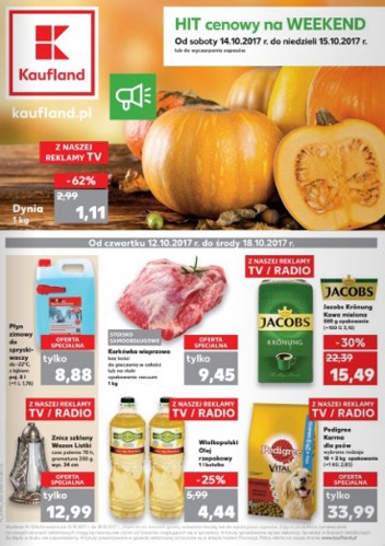Na okładce aktualnej gazetki promocyjnej sieci marketów Kaufland znajdziemy produkty z reklamy TV / RADIO, czyli kawę mieloną Jacobs Kronung 500 g za 15,49 zł, znicz szklany Wazon Listki o gramaturze 250 g i czasie palenia 70 h za 12,99 zł, olej rzepakowy Wielkopolski 1 litr za 4,44 zł karmę dla psów Pedigree 12 kg za 33,99 zł oraz Hit cenowy na Weekend dynię 1 kg za 1,11 zł, a także pozostałe produkty – płyn zimowy do spryskiwaczy z lejkiem o pojemności 5 litrów za 8,88 zł i karkówkę wieprzową bez kości do pieczenia w całości lub na steki w opakowaniu vacuum w cenie 9,45 zł za 1 kg.