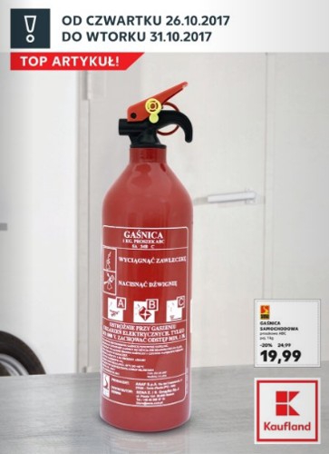 Pierwsza strona gazetki promocyjnej sieci marketów Kaufland prezentuje TOP Artykuł – gaśnicę samochodową proszkową ABC o pojemności 1 kg za 19,99 zł.