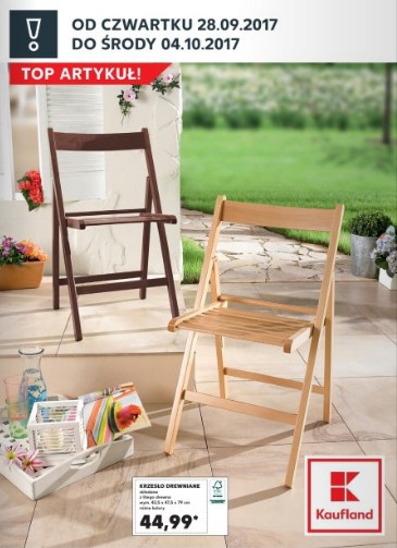 Top artykuł z gazetki promocyjnej sieci marketów Kaufland to składane krzesło drewniane z litego drewna w różnych kolorach za 44,99 zł.